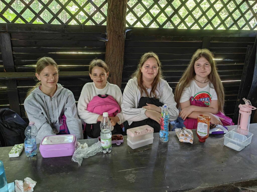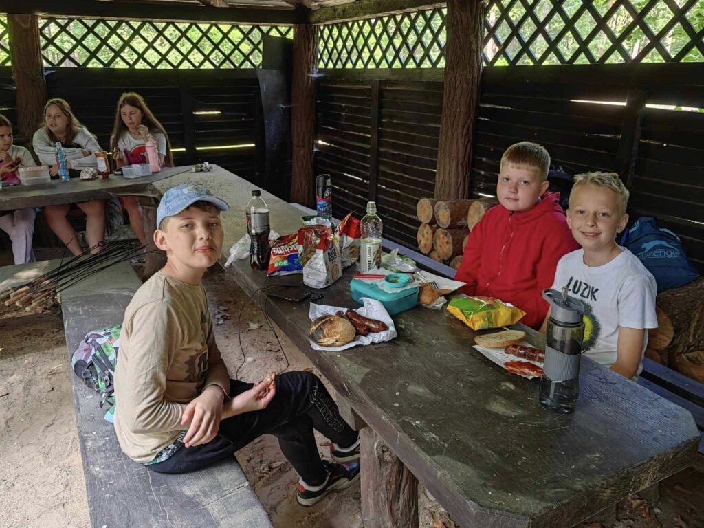 Pierwszym punktem programu było spotkanie przy wigwamie, gdzie na uczniów czekało ognisko, pieczenie kiełbasek i wspólne zabawy. Następnie cała grupa udała się na plażę nad jeziorem, gdzie dzieci mogły odpocząć i spędzić wspólnie czas.