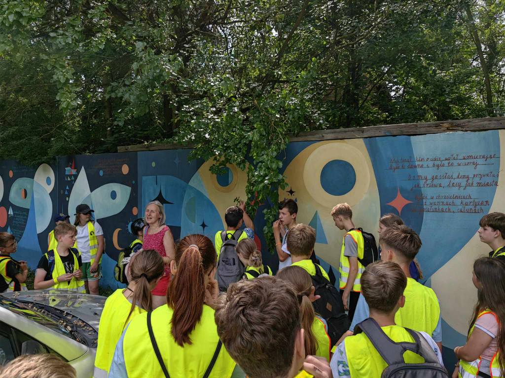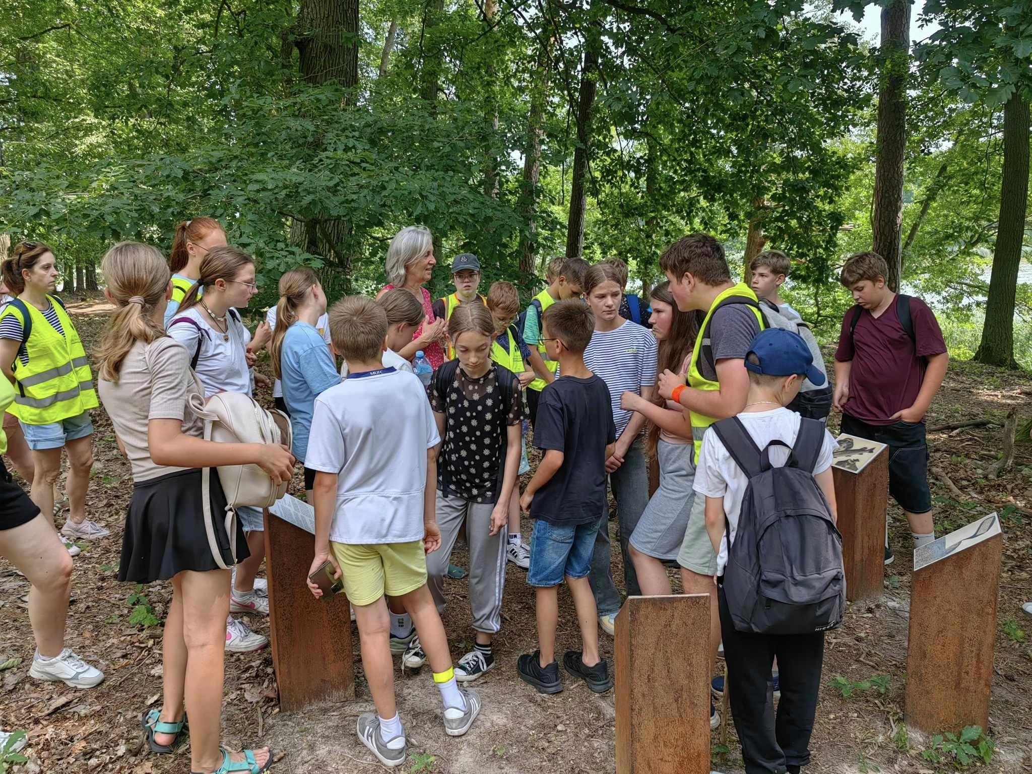 Następnie udaliśmy się rowerami do Perkowa, gdzie rozpoczęliśmy wędrówkę ścieżką dydaktyczną „Śladami Wisławy Szymborskiej”. Trasa była wzbogacona o artystyczne instalacje nawiązujące do twórczości noblistki. Poszczególne przystanki pozwalały nam lepiej zrozumieć jej poezję oraz spojrzeć na świat z innej, refleksyjnej perspektywy. Instalacje były nie tylko estetycznie wykonane, ale również skłaniały do myślenia i rozmowy. Cała ścieżka stanowiła piękne połączenie sztuki, natury i edukacji.