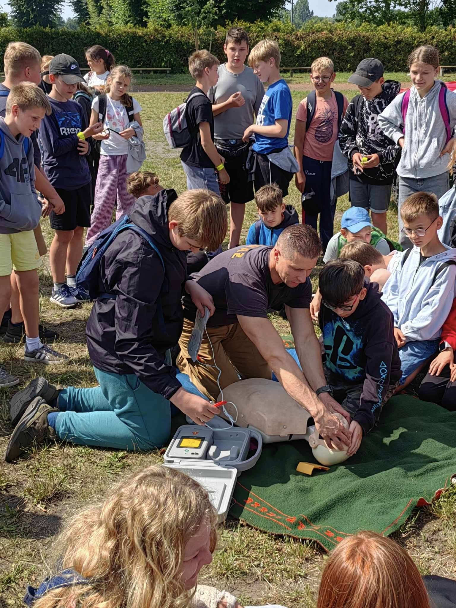Pierwszym przystankiem była szkoła w Przemęcie, gdzie uczniowie uczestniczyli w spotkaniu ze strażakami, policjantami oraz ratownikami wodnymi. Podczas prelekcji służby mundurowe przedstawiły najważniejsze zasady bezpieczeństwa, jakie należy zachować w czasie letniego wypoczynku – zarówno nad wodą, jak i w codziennych sytuacjach. Uczniowie mieli okazję zadawać pytania, a także obejrzeć sprzęt ratowniczy i poznać kulisy pracy przedstawicieli różnych służb. Spotkanie to było nie tylko pouczające, ale również bardzo ciekawe.